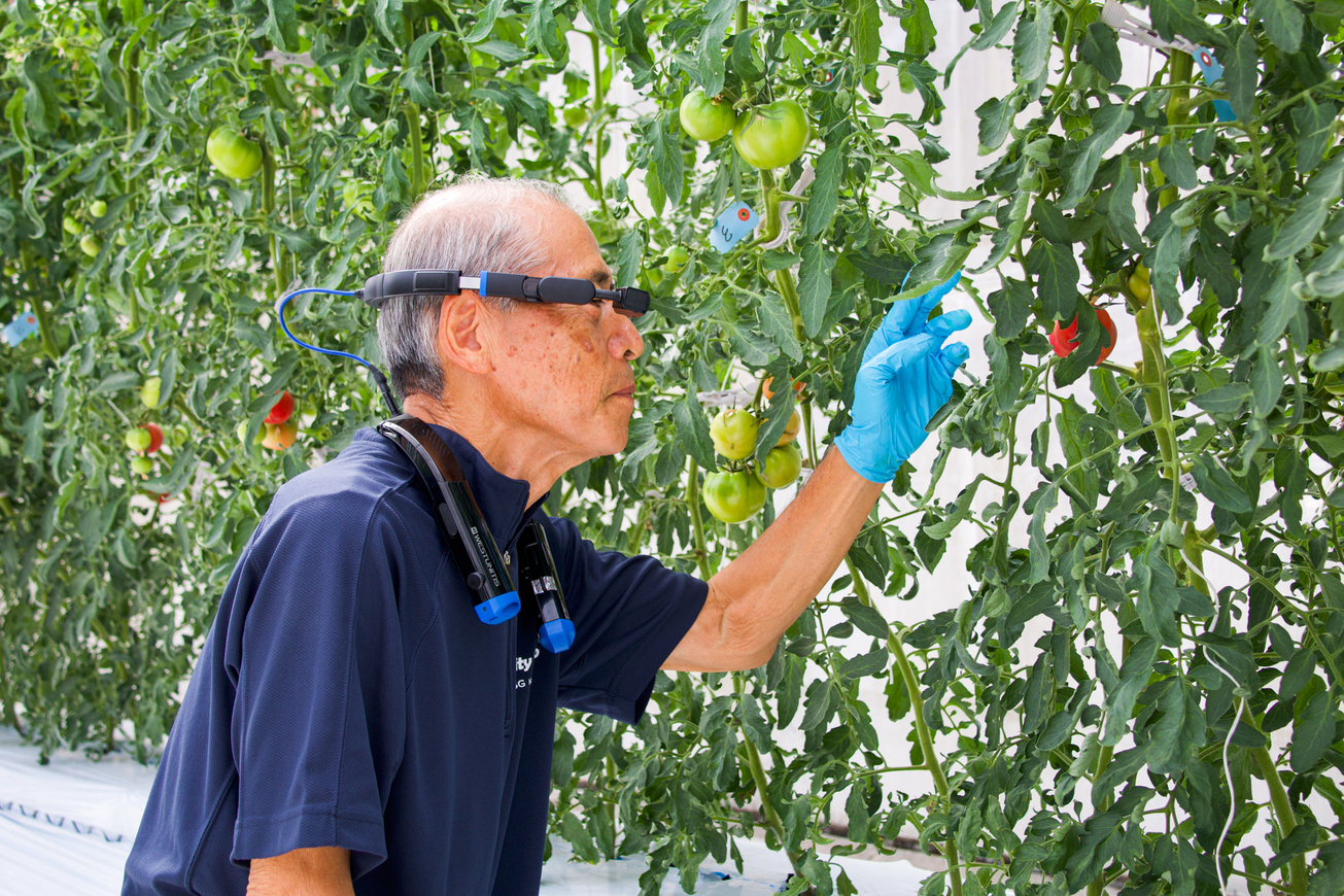 Smart glasses that can be used to measure the length of the stalks.     Photo by Emi Takahata
