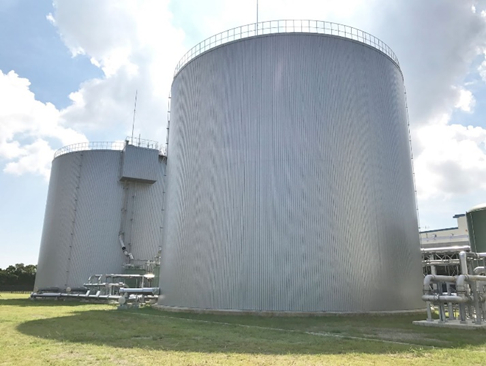 The fermentation tanks are 21 meters in diameter and 18 meters high and can hold 5,000 tons of waste.      Source: Toyohashi City Waterworks & Sewerage Bureau