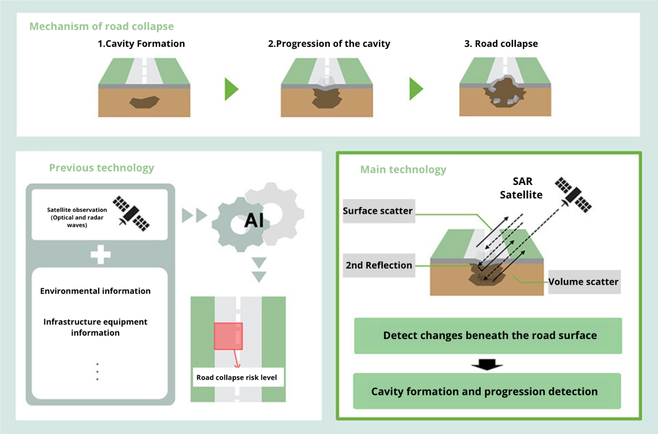 Against this backdrop, NTT has successfully demonstrated what it describes as the world’s first method for detecting precursors to road sinkholes using Synthetic Aperture Radar (SAR) satellites. By analyzing the reflection characteristics of microwaves emitted from orbiting satellites, the system can identify anomalies developing underground. Because high-risk areas can be narrowed down without on-site visits, the technology is expected to streamline inspection processes, reduce costs, and improve safety.