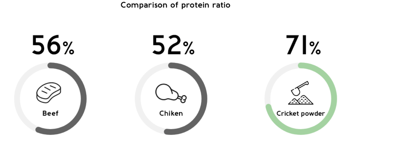 Crickets are high in protein, low in fat, and contain essential nutrients such as iron, zinc, and folic acid. Their exoskeleton also holds dietary fiber that can absorb and remove cholesterol. Compared with beef production, raising crickets requires 1/2000 the water, 7/100 the feed, and produces only 1/25 the greenhouse gas emissions.