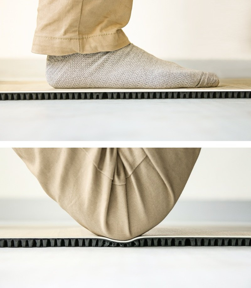 Inspired by traditional Japanese ingenuity, Shimomura turned to ninja culture for ideas. The weight-distribution principle behind mizugumo—water shoes that allowed ninjas to walk across swamps—helped shape the flooring’s structural design. He also drew from the hidden features of a ninja yashiki, or ninja house, where seemingly ordinary interiors concealed protective tricks. “We want homes to feel bright and comfortable, but when an accident happens, the floor itself protects you—like a hidden safeguard,” he explained.