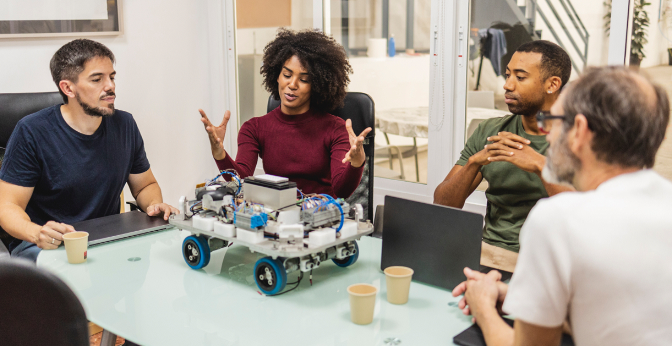 A visual representation of a robotics engineering team collaborating in a startup environment, highlighting the complexities and collaborative efforts involved in robotic implementations