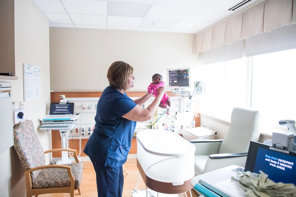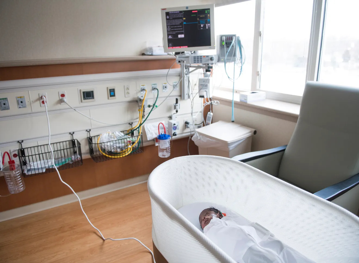 A newborn baby sleeps in a SNOO in a hospital       Photos courtesy of Happiest Baby (Same below)
