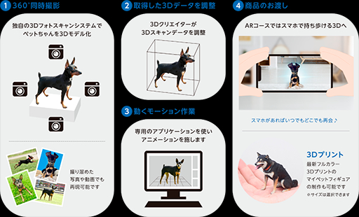 同社のサービスは、まず愛犬を独自の3D(3次元)フォトスキャンシステムで撮影、立体的なモデルデータを作成する。さらに、AR(拡張現実)技術によって、再現した愛犬の様々な姿や動きをその場の景色と重ね合わせてスマホや専用ゴーグルの中に映し出す。