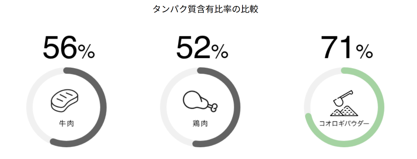 食用コオロギは、良質のたんぱく質に加え、鉄分、亜鉛、葉酸など豊富な栄養素があり、外骨格部分にはコレステロールなどを吸着して排出する食物繊維などを多く含む。一方、その環境負荷を牛肉と比べると、コオロギ生産に必要な水は2000分の1、飼料は100分の7で済み、生産過程で発生する温室効果ガスは25分の1に抑えることができる。