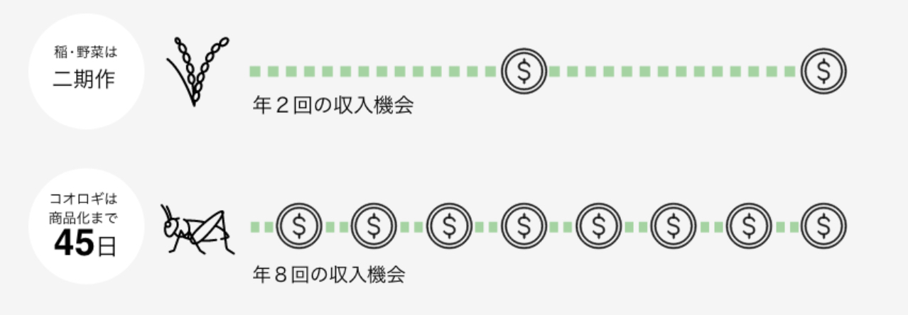 小規模な農家では、米や野菜の生産で得られる収入は年に2回。一方、コオロギの生産は農家の軒下で簡単に始めることができ、卵から孵化までにかかる日数は約45日。本業の農業を続けながら、年8回の副収入を手にすることができる。