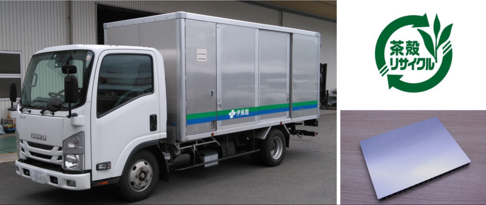新たな茶殻活用法として昨年開発されたのが「茶殻配合軽量パネル」だ。同社では製品の運搬に営業用トラックを多く運用しているが、軽油の使用量が多く社内課題になっていた。車体を軽量化すればCO2の排出量を削減できる。当時、トラックのドアなどに使われていたパネルはA4サイズ1枚で1キロ強の重みがあったが、茶殻配合樹脂を使用することで同サイズ1枚を240gに軽量化、従来の3トン車と比較して最大 110kgの軽量化に成功した。
