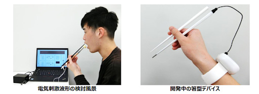 デバイスは、2022年4月に、スマートウォッチにケーブルを繋いで使用する箸型デバイスが開発され、その後、同年9月にはスプーン型やお椀型のデバイスも開発されている。いずれも食器から発生する電気刺激で、減塩食品の味わいを増強させる。