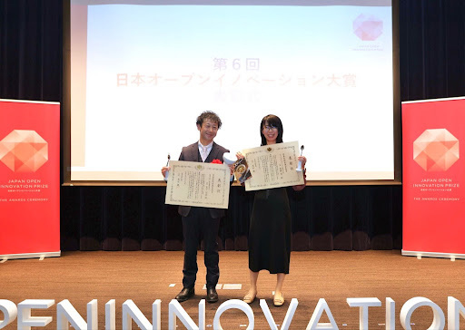日本オープンイノベーション大賞を受賞した宮下芳明教授 と キリンホールディングス株式会社ヘルスサイエンス事業部 新規事業グループ 佐藤愛氏       キリンホールディングス 提供