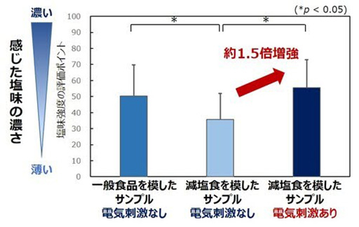 電気刺激を加えた場合、塩味の味覚効果は刺激なしの減塩食に比べ1.5倍の強さとなった。     キリンホールディングス 提供