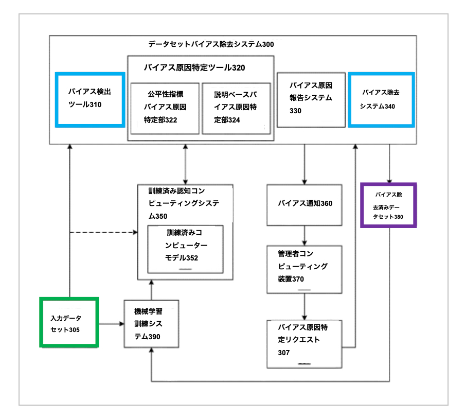 ’331特許に記載された発明は、データセット内のバイアスを検出し、偏ったデータを特定して的確に除去することで、公平なデータセットを作成します。’331特許のバイアス検出および除去を示すブロック図を以下の図6に示します。