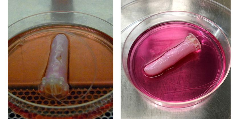 これまでの培養皮膚は平面上に作られてきたが、ロボットのような立体物での実現は新しい取り組みだった。同グループが開発した培養皮膚は、皮膚の表面にある「表皮」とその内側にある「真皮」で構成され、1.5ミリほどの厚さで指型ロボット全体をくるんでいる。