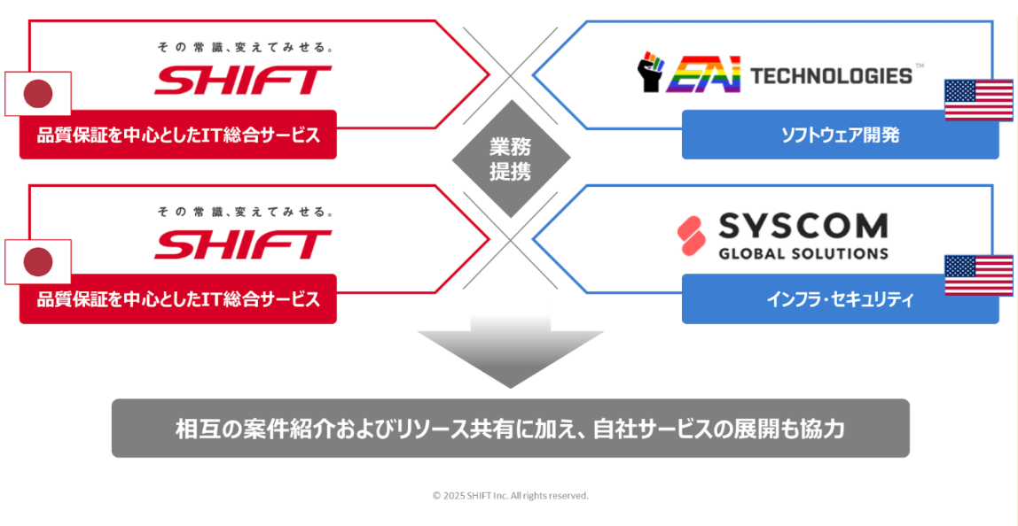 小島:ここ最近はSHIFTの既存のお客様から海外展開もサポートして貰えないかといった相談が増えてきました。そうしたニーズにしっかりと応えていきたいと思い、昨年の12月に米国企業2社と業務提携を行い、今年2月にはSHIFT USAを設立しました。1社目はEAI Technologies, LLC(米国・バージニア州)で、ソフトウェア開発に強みがあり、流通/物流・通信・セキュリティ市場にて大規模な顧客を持っている会社です。2社目はSYSCOM GLOBAL SOLUTIONS INC.(米国・ニューヨーク州)です。こちらはインフラ・セキュリティに強みを持ち、金融・通信・商社・SIを中心に幅広い規模の顧客を多数有しています。このように、強みの異なる2社と業務提携をすることで、相互の案件紹介およびリソース提供に加えて、自社サービスの展開についても協力できる関係構築を目指しています。
