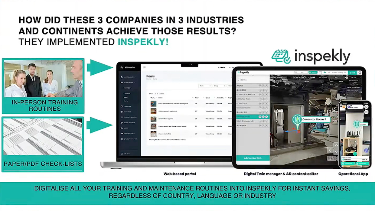 Inspeklyは複数の業界での導入実績を持ち、建設業、製造業、不動産管理などさまざまな分野で施設管理とトレーニングの効率化に貢献している。特に大規模施設における導入事例では、短期間でのシステム構築と運用開始を実現し、ROIの早期達成を実現するという。