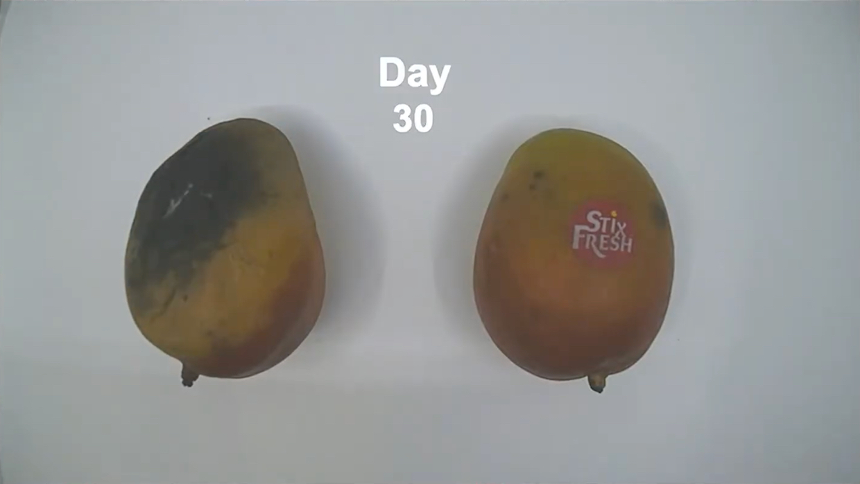 StixFRESHは、植物から抽出した天然成分を、食品に直接触れても安全な基準で製剤化し、果物に直接貼るステッカーや、食品と一緒に包装する小袋の形で提供される。マンゴーを使った実証実験では、未処理のマンゴーが14日目に腐敗し始めるのに対し、ステッカーを貼ったマンゴーは腐敗に対する抵抗力が大幅に向上し、保存期間が2倍になった。
