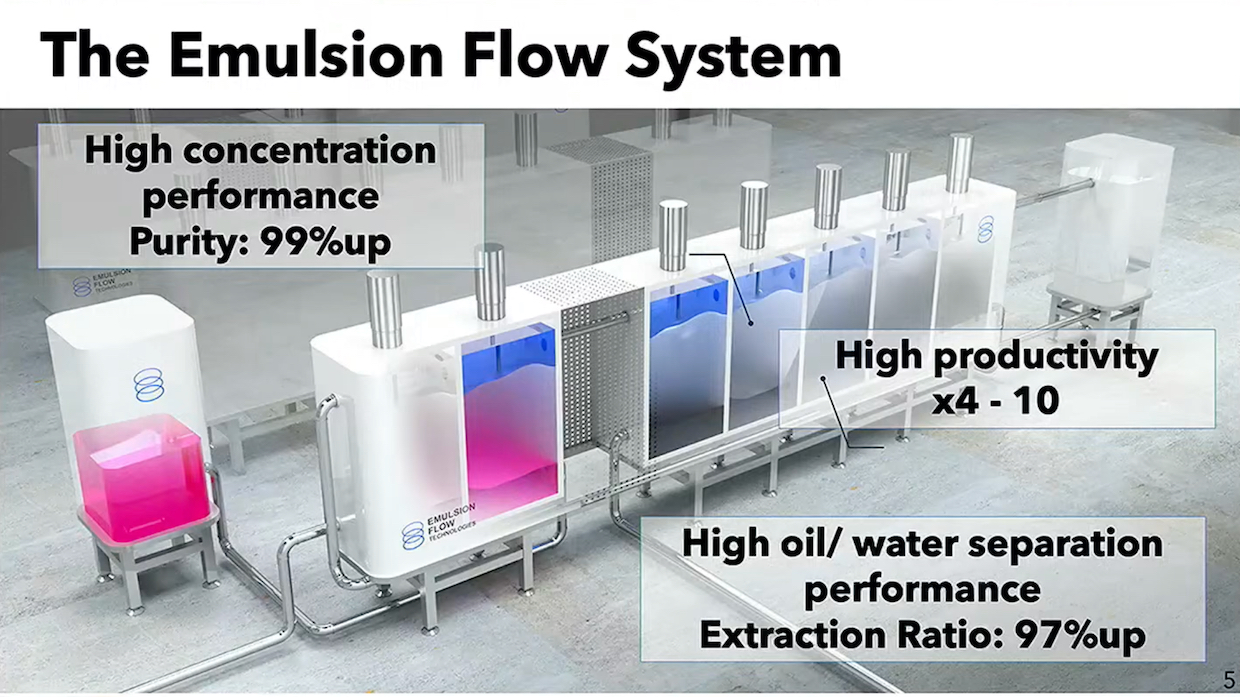 日本原子力研究開発機構からのスピンオフであるEmulsion Flow Technologies(EFT) は、水と油の乳化を機械的設計と特殊な溶媒レシピで作り出し、液体から特定の材料を高純度・高効率で抽出する技術を確立することで、これらの問題を解決しようとしている。