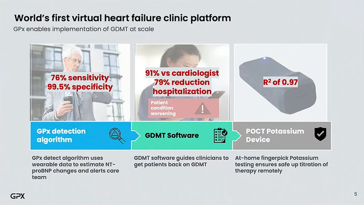 第二に、医師が適切な薬物療法を処方するための臨床ソフトウェアで、医師の判断と91%一致し、入院を79%削減する。第三に、同社は血中カリウム濃度の在宅測定技術の開発に取り組んでいる。カリウムは心不全患者の管理において重要な指標であり、従来は頻繁な病院での血液検査が必要だった。General Prognosticsは、この課題を解決するため、患者が自宅で簡便にカリウム値を測定できるデバイスの開発を進めている。