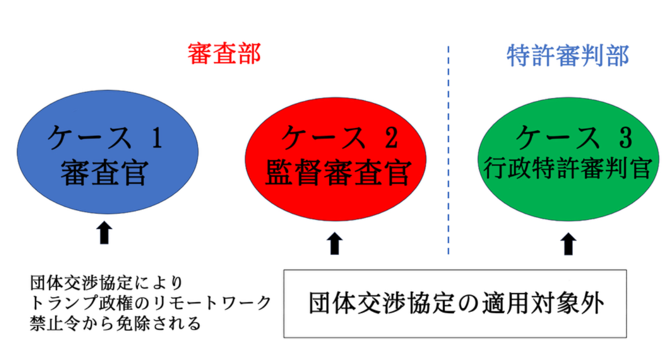 また、リモートワーク禁止令の影響は、USPTOの職員の職種によって異なります。図1に示されているように、特許審査部では、通常の審査官(ケース1)は団体交渉協定の適用を受けているため、トランプ政権のリモートワーク禁止令があっても引き続きリモートワークが認められます。一方、監督審査官(ケース2)は団体交渉協定の適用を受けていないため、出勤が義務付けられます。
