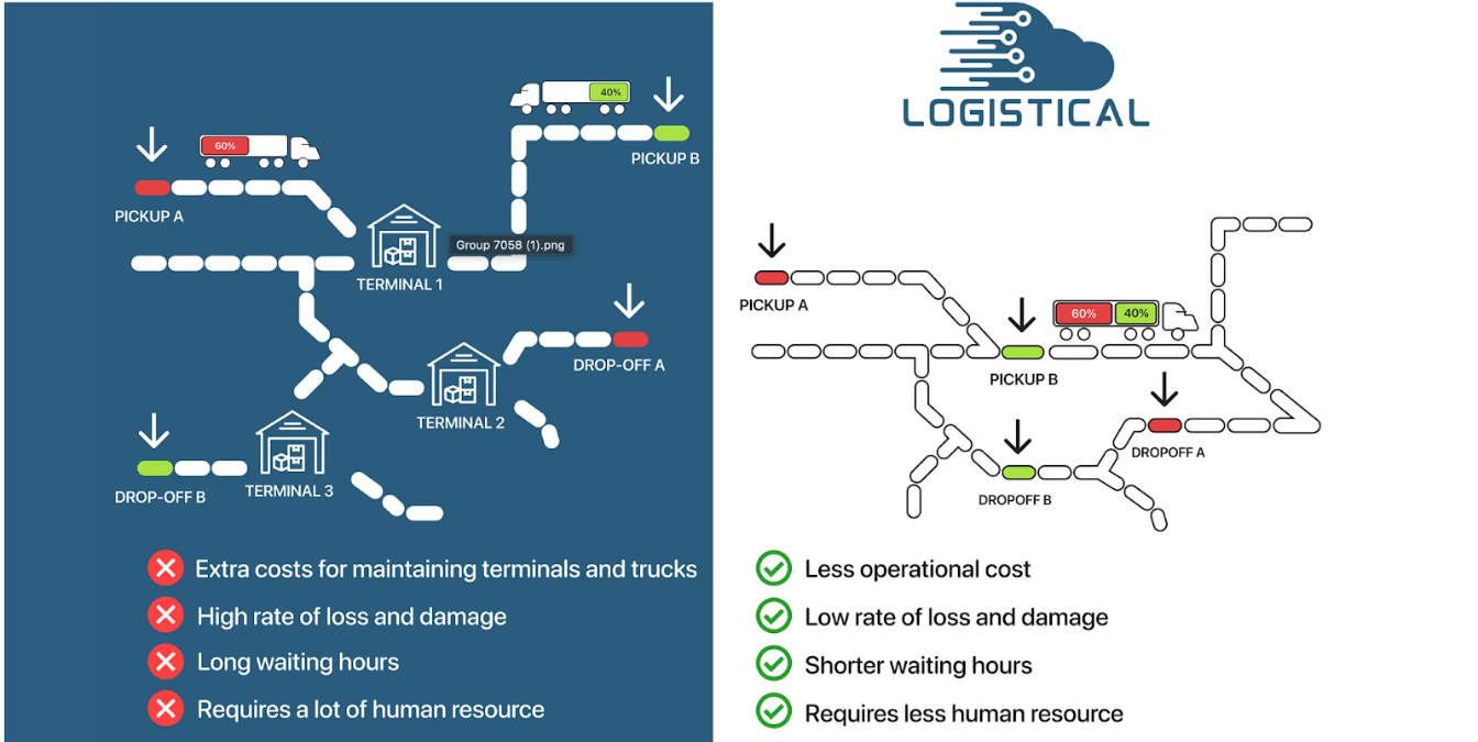 Logisticalは、「共同配送」という考え方に重点を置いている。これは、同じ地域に向かう配送をAIを使ったマッチングを活用してまとめる仕組みを作ることで、トラック輸送システムの効率を大幅に向上するというものだ。例えば、ある会社がトラック積載量の40%しか必要としない場合、残りの60%を他の会社と共有することで、トラックの費用を分担できる。