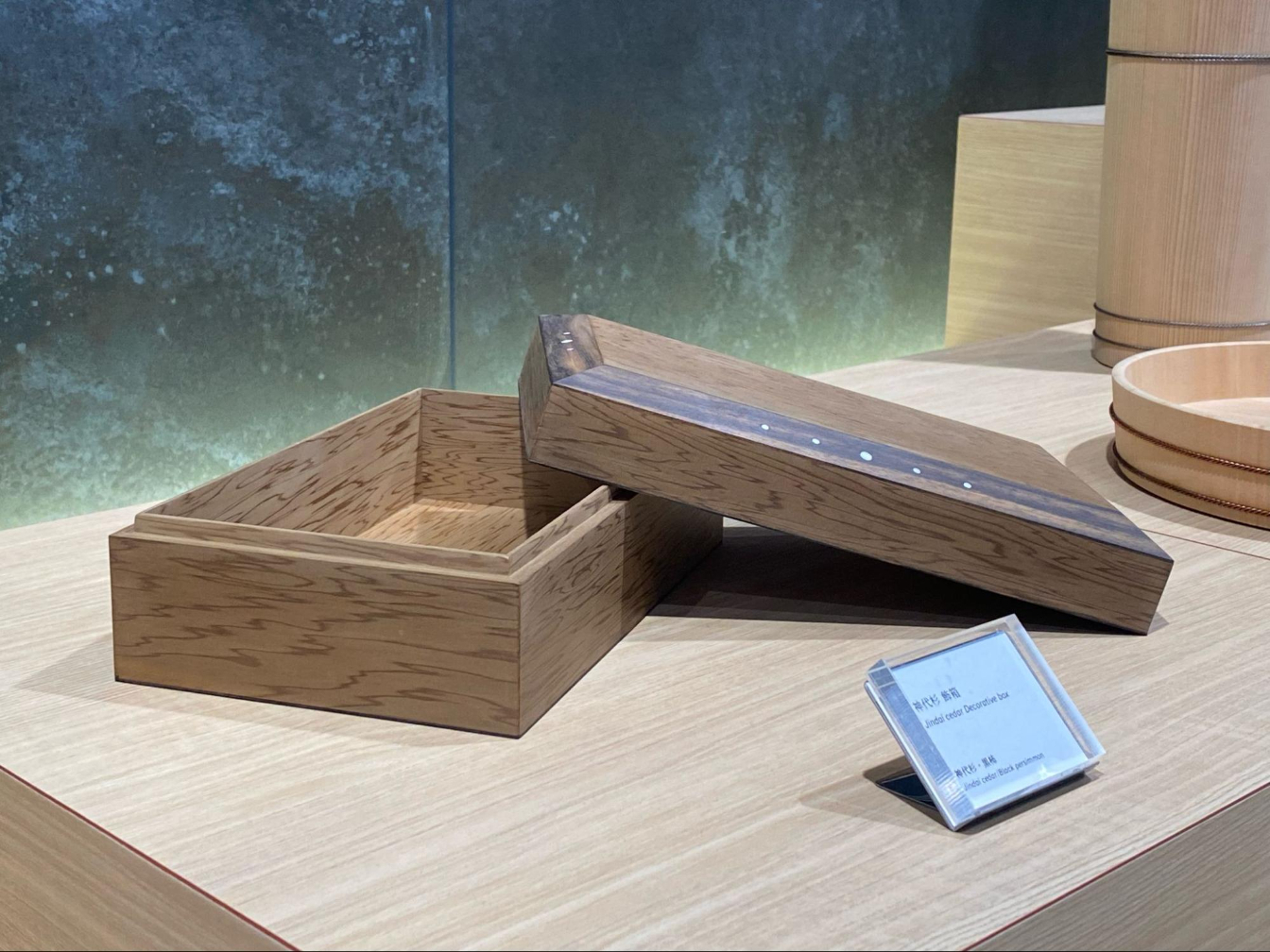 指物工法「留形隠し蟻組接ぎ」の技術を使い作製された神代杉の飾り箱。      黒田工房 提供
