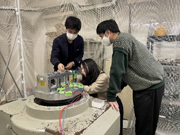 木造人工衛星の振動実験の準備をする京大の学生チーム。      京都大学 提供