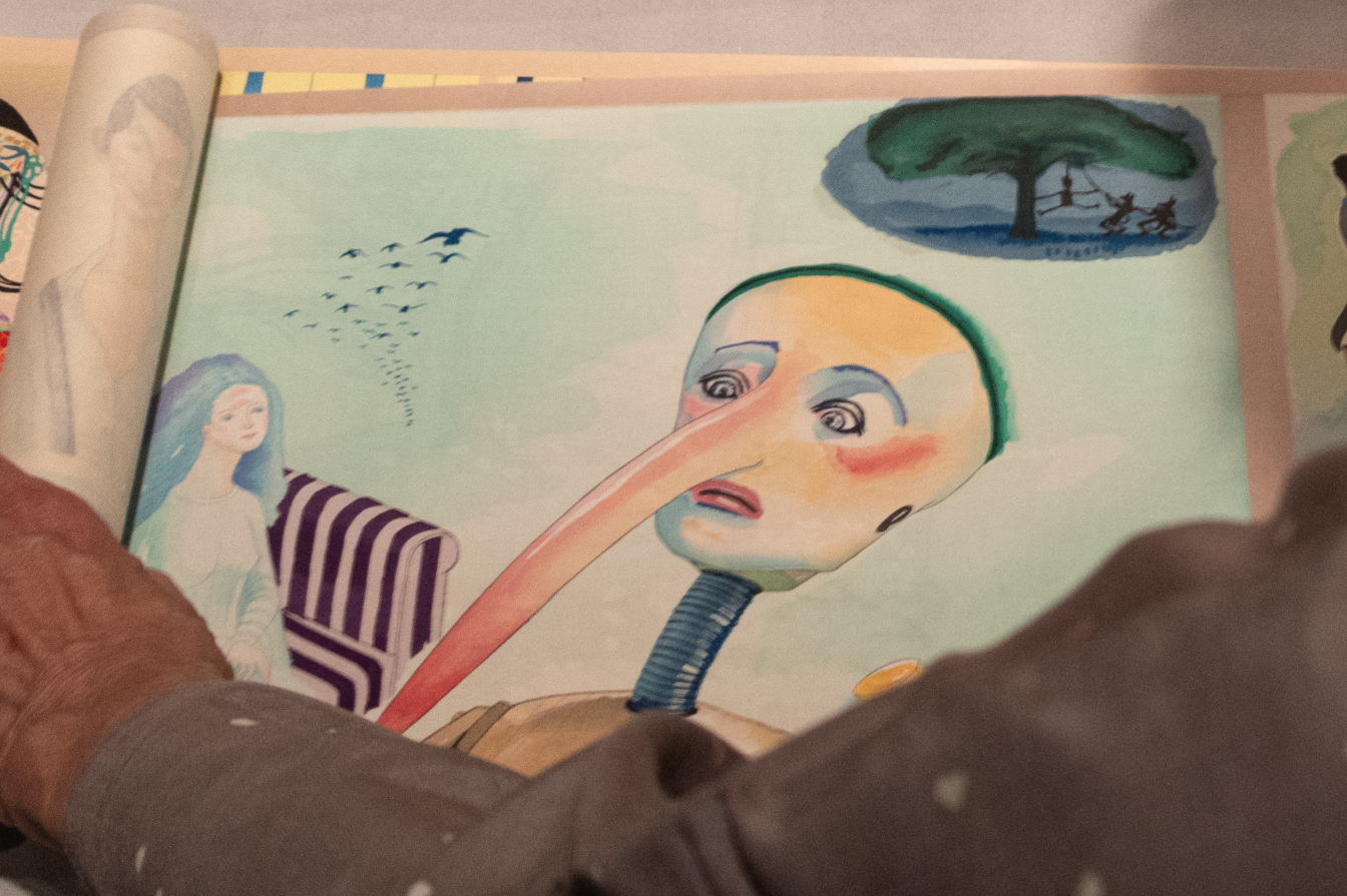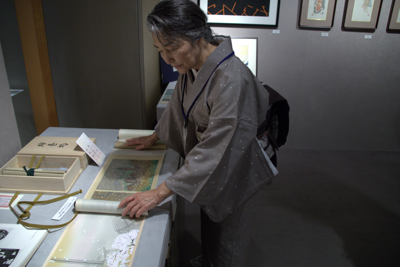 Takahashi Kobo has been making ukiyo-e woodblock prints for over 160 years, using techniques and materials that have an over 400-year history in Tokyo and other parts of Japan. Previously, the company has made contemporary woodblock prints featuring anime characters such as Ultraman. But for this exhibition it featured picture scrolls with designs by contemporary illustrators. These featured scenes from Western fairy tales such as “Pinocchio” and “Little Red Riding Hood,” as well as pictures of items from the Shoso-in, the treasure house of Todai-ji temple in Nara.