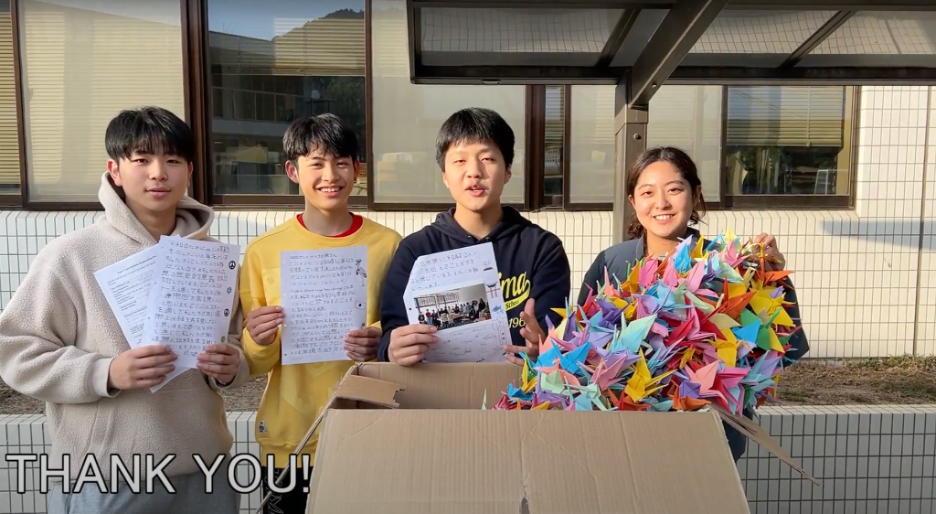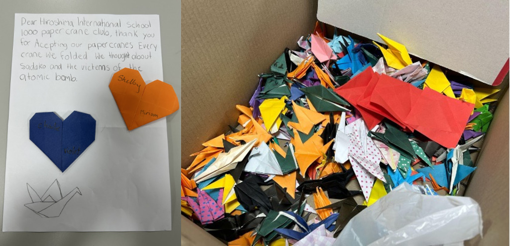 “The Thousand Crane Club” is an extracurricular activity group based at Hiroshima International School whose members have been taking origami cranes on behalf of senders from around the world. “Origami” is the Japanese art of paper folding.