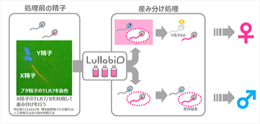 Professor Shimada’s research led to a completely different technique. Instead of a flow cytometer, it uses a drug that binds to a receptor found only in mammalian X-bearing sperm, making it possible to easily separate X-bearing (female) and Y-bearing (male) sperm and use them in artificial insemination. Lullabio is responsible for the development, manufacture and marketing of the new chemical.