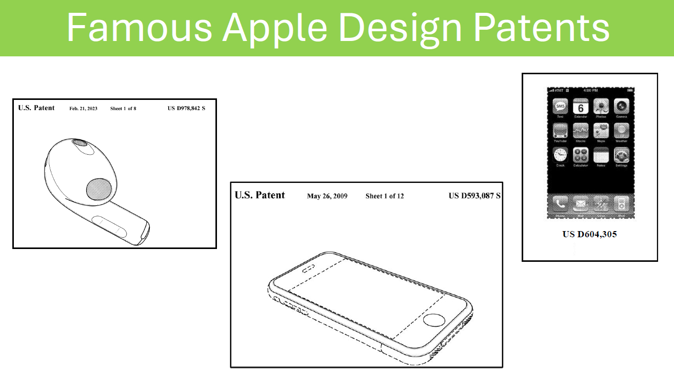 For some AI startups, having a moat of patents will be the best way to protect their AI innovations. But most AI startups are unaware that there are different types of patents for different purposes. For example, there are design patents and utility patents. Design patents protect the ornamental design of a product. Design patents used together with trade secret protection provide a good combination of publicly available protection and secrecy. Several famous Apple design patents are set forth below in Figure 3.