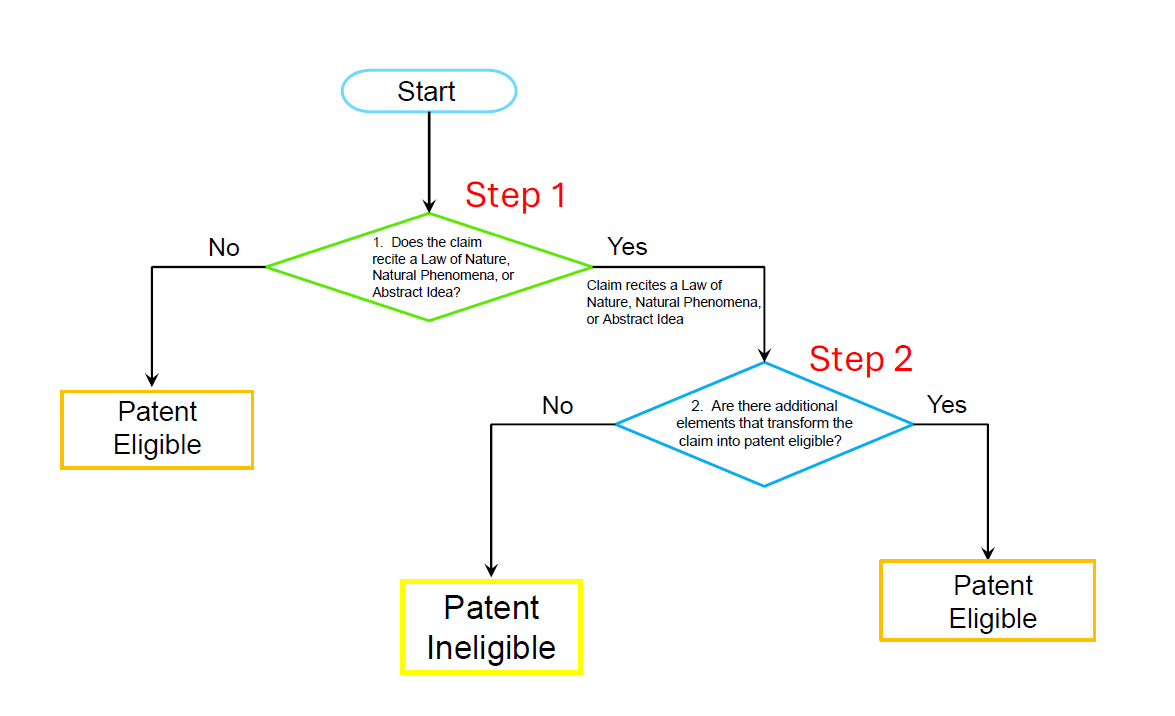 In order to determine whether an AI innovation fits within an exception and is therefore patentable in America, the Patent Office and Courts employ a framework consisting of 2 main inquiries. This framework is set forth below in Figure 5, and it is called the Alice-Mayo test, for 2 famous cases decided by the U.S. Supreme Court.