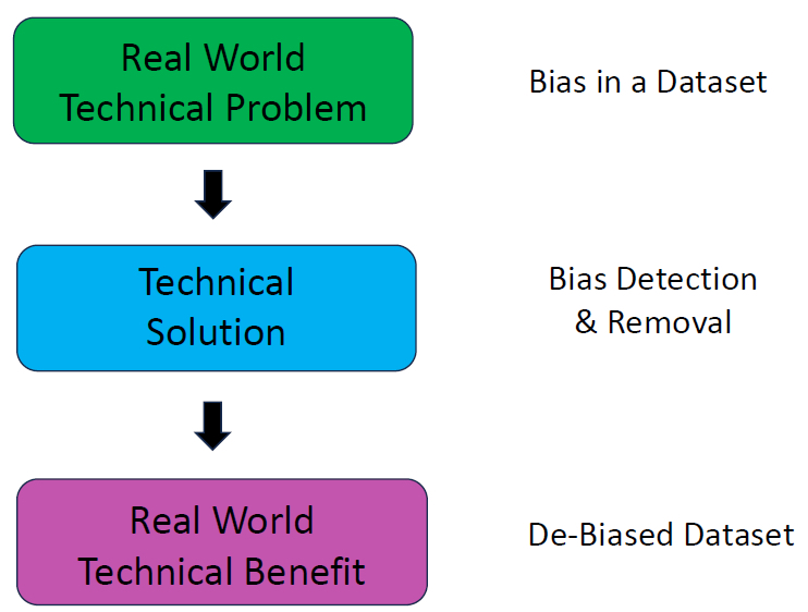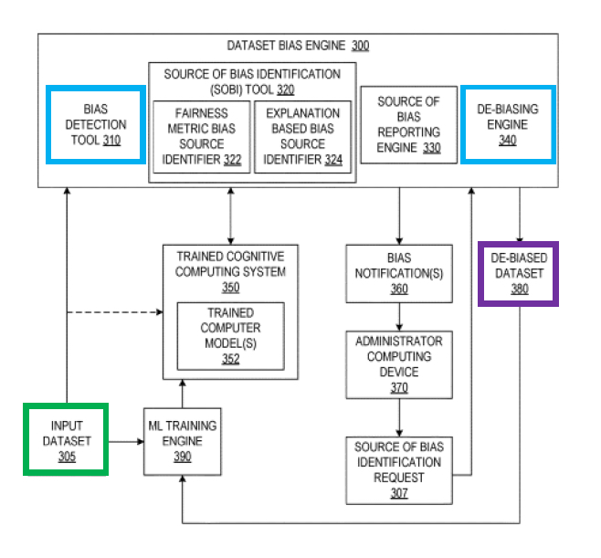 As shown in Figure 8 supra, Bias Detection Tool 310 detects bias in Input Dataset 305. If bias is identified, the Source of Bias Identification Tool 320 locates the biased data entrees. Finally, the De-Biasing Engine 340 removes the biased data entrees from Input Dataset 305, to create De-Biased Dataset 380. A simplified summary of the invention claimed in the ’331 Patent is set forth below in Figure 9.