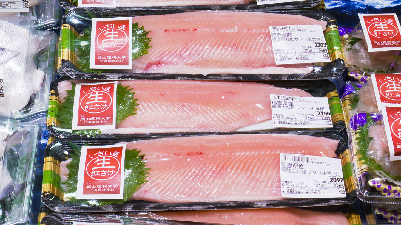 The RAS-farmed salmon was sold at supermarket Ichii in Fukushima for a three-day trial period this July. It appeared in various forms, from large filets to sushi, and even sandwiches.