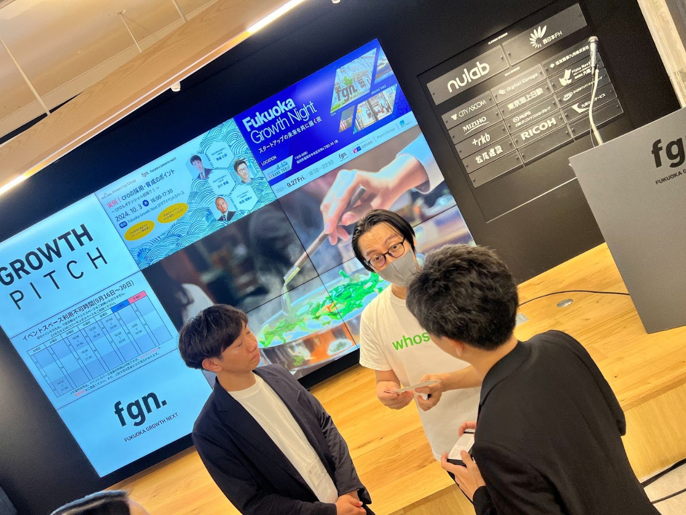 Wei-Chen Lo (center), head of Japanese operations for Taiwanese company Whoscall, which offers online fraud prevention services, discusses the launch of its services into the Japanese market from Fukuoka City.