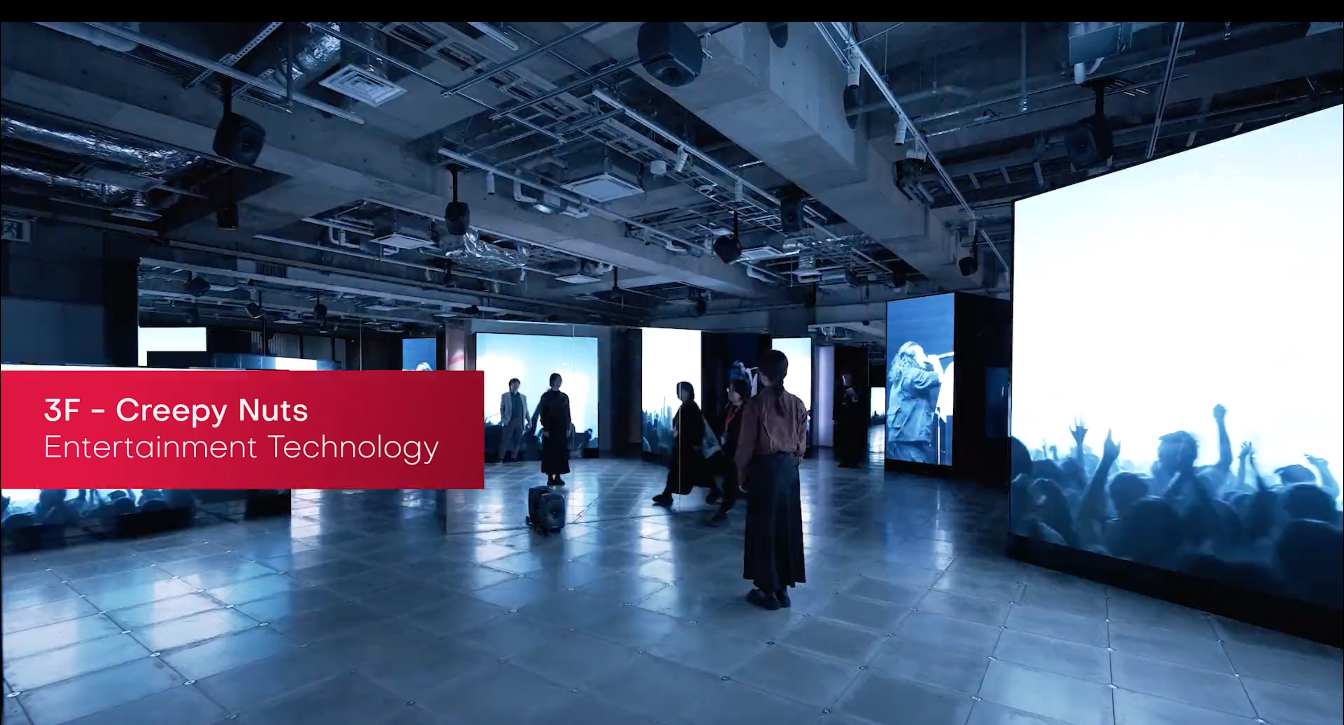On the third floor, visitors are immersed in a live concert experience of hip-hop duo Creepy Nuts, surrounded by eight high-resolution LED displays and around 20 speakers. Benches are equipped with haptic technology, allowing guests to feel music through vibrations.