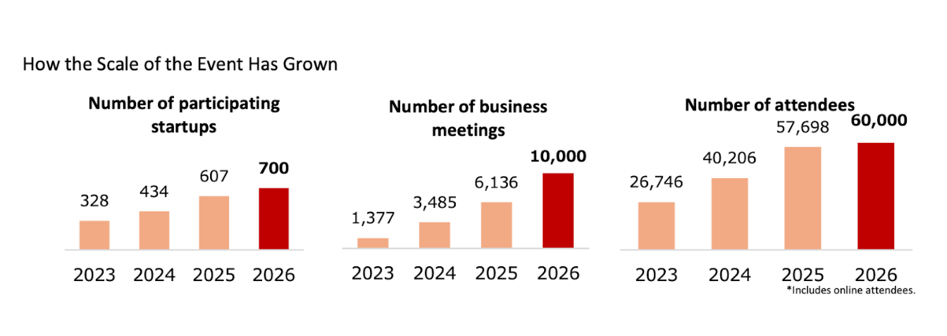More than 700 startups from around the world are scheduled to exhibit, up from 607 at the previous event. Exhibitors will participate alongside large corporations and startups hosted by regions and municipalities across Japan.