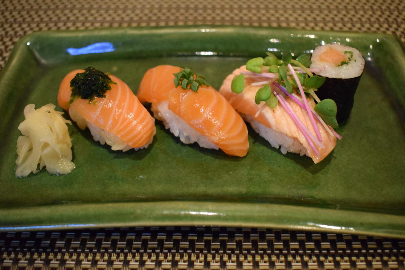 Salmon sushi set sold at SusHi Tech Tokyo 2024.        Photo: courtesy of Tokyo Metropolitan Government (Same below)