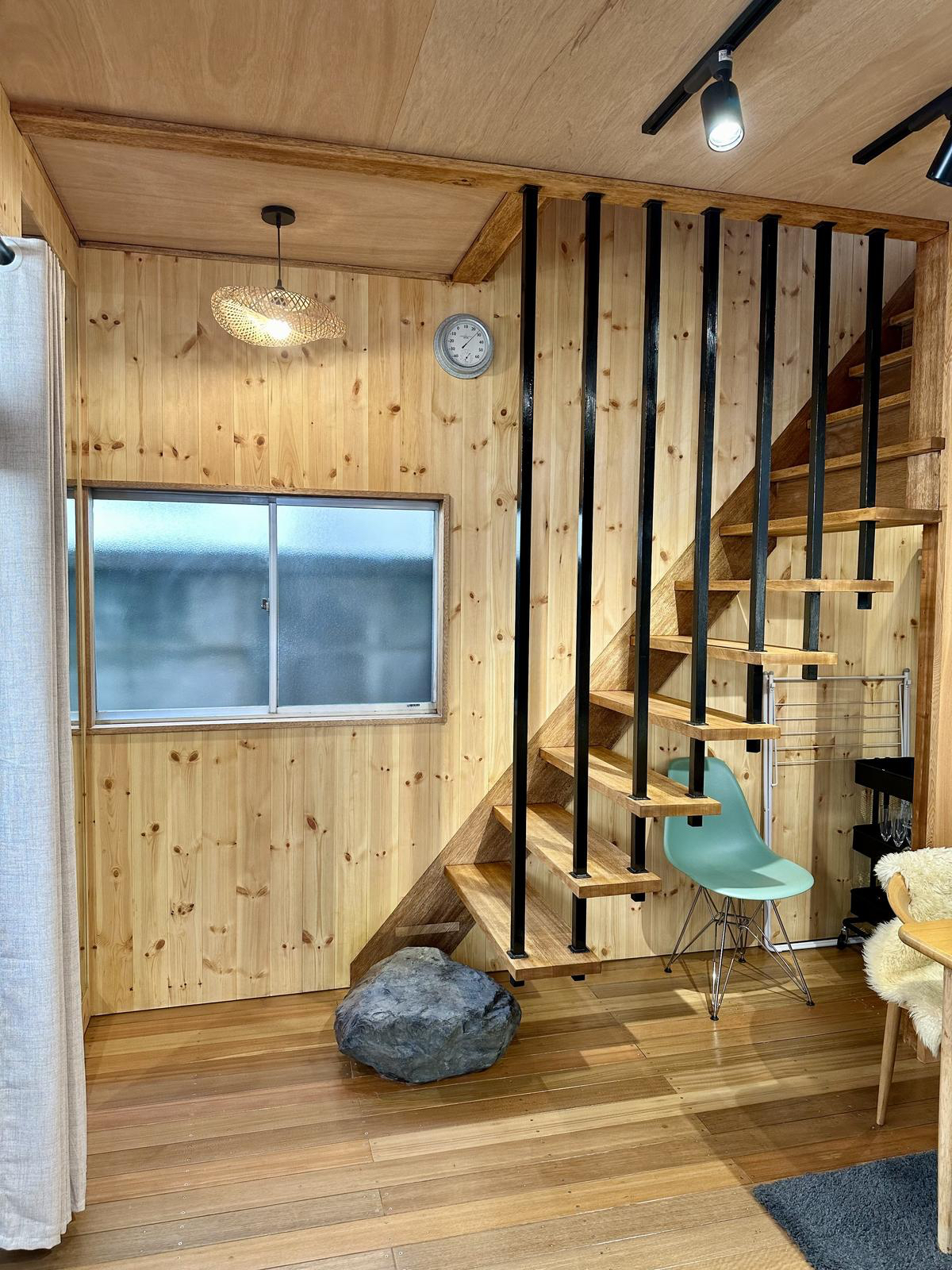 By removing the risers of the stairs, the space below became bright and comfortable. A maguro-ishi (jet-black stone) is playfully placed at the bottom of the stairs.