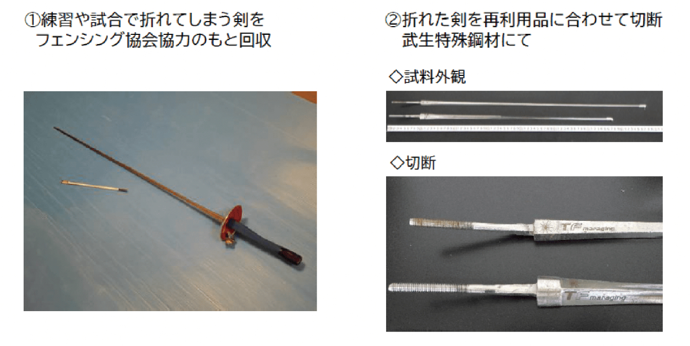When the company made kitchen knives from the broken fencing blades, they found that hardness and other characteristics related to sharpness were of a usable level. The company plans to process the swords into medals and kitchen and other knives by forging; and going forward, it aims to also reclaim and reuse fencing swords, which are not currently made and processed in Japan.