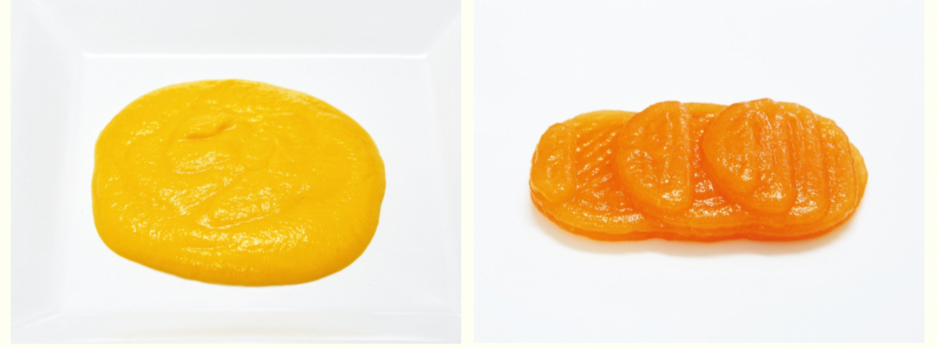 従来のペースト状介護食 (左) と3Dプリンターで作られた形のある介護食。     提供:山形大学のホームページ