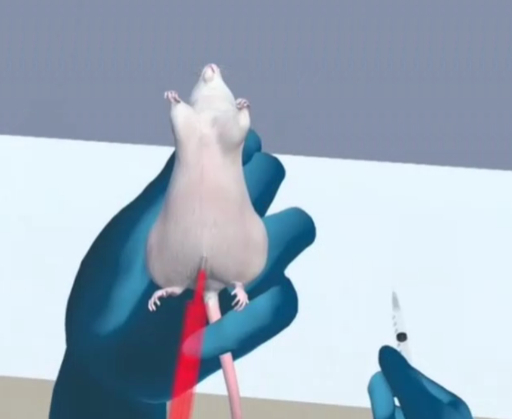 ゴーグルを装着すると、目の前に仮想マウスが現れる。学生はマウスに薬物を投与し、反応を観察したり、痙攣などプログラムされた症状を抑える為に、どの薬を使えばいいかを実際に試しながら学ぶことができる。結果をレポートとしてまとめるまで反復学習が可能になる。