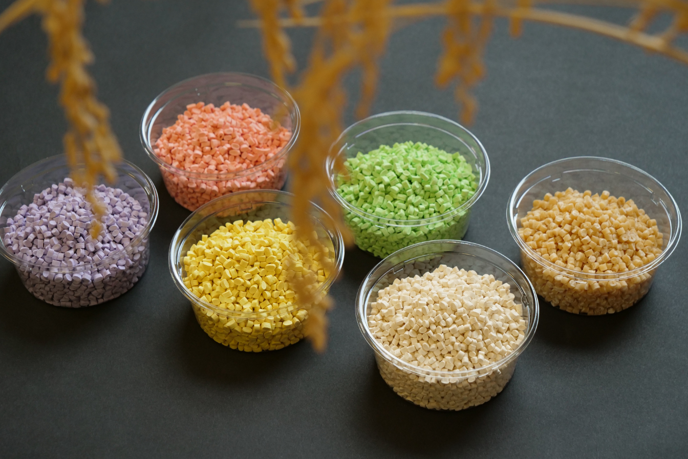 カラフルに色付けをされたライスレジン樹脂     バイオマスレジンホールディングス 提供