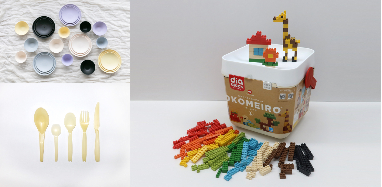 食器などのテーブルウェア「ほわり」(左)ライスレジンから作られたおもちゃ「OKOMEIRO」(右)     バイオマスレジンホールディングス提供