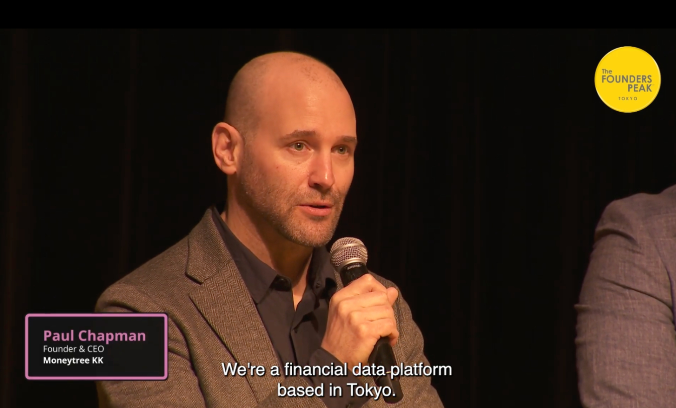 ポール・チャップマンさん(以下ポール): Moneytreeの創業者兼CEOのポール・チャップマンです。Moneytreeは、東京に拠点を置く金融データプラットフォームの会社です。私たちは、SMBC(三井住友銀行)、MUFG(三菱UFJ)、ゆうちょ銀行など、日本の大手銀行と提携しています。また、日本で急成長しているスタートアップも、私たちのデータプラットフォームを利用して、2,500以上のデータソースにアクセスしています。私たちは、このビジネスに長く携わっており、今日は長期的な視点から皆さんにお話しできることを楽しみにしています。ティムほど長くはありませんが(笑)。