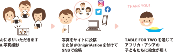 このアクションへの参加に必要なのは、おにぎりにまつわる写真だけ。SNS、またはおにぎりアクションの特設サイトに「#OnigiriAction」のタグをつけて投稿すると、1枚の写真投稿につき給食5食分に相当する100円の寄付を協賛企業・自治体が提供し、アフリカ・アジアの子どもたちに食事をプレゼントできる仕組みだ。投稿する写真には厳しい制限はかけず、参加のハードルを下げる工夫をしている 、という。