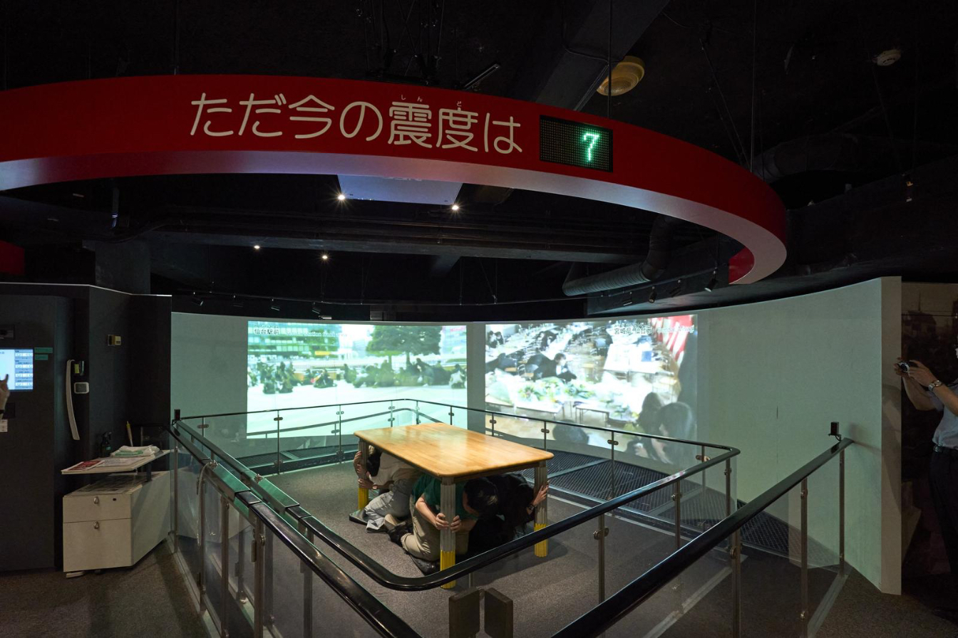 最後的地震模擬體驗中,參加者被指示躲在放置於晃動舞台上的大型桌子下。第一次模擬假設在震動開始前,日本的緊急地震速報已發出。第二次模擬則無預警,震動更劇烈。這一情境再現了2011年東日本大震災,螢幕上播放當時的影像。搖晃不規則,時而減弱又再次強烈。