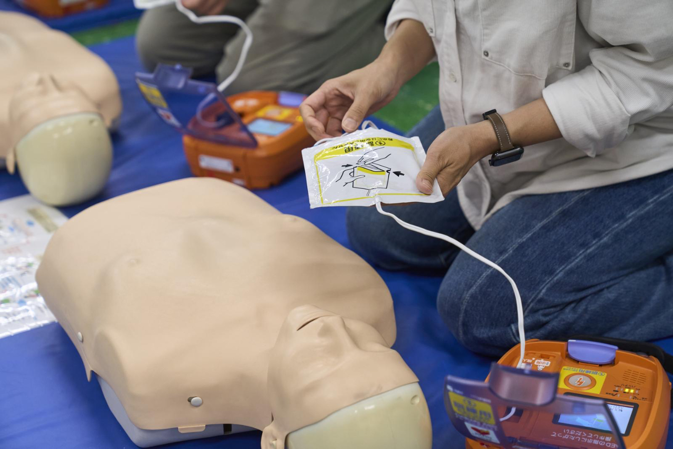 講師教導大家,當有人倒下時,可以用日語大喊「請救救我!(たすけてください!)」或「誰快來幫忙!(だれかきてください!)」;當然也可以直接喊「Help!」。考量到AED的操作說明是用日語寫的,以及緊急時刻很難冷靜按照手冊操作,用人體模型實習是很寶貴的經驗。