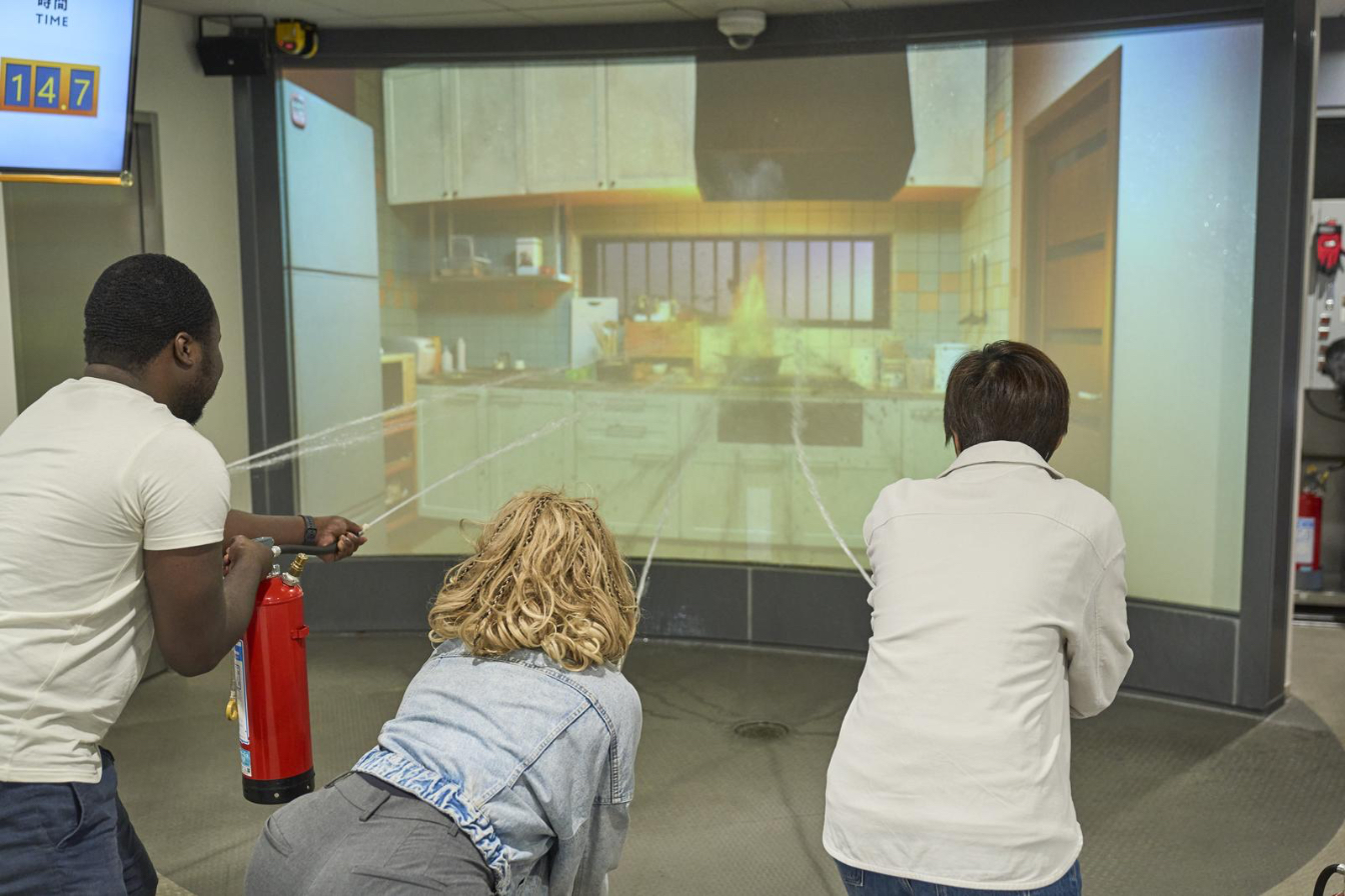 接著是滅火器操作練習。使用方法很簡單,依序操作「拉插銷(Pin)」、「握住噴管(Hose)」、「壓下把手(Lever)」(這些零件的名稱與英語相同)。導覽使用的滅火器噴出的不是實際滅火劑而是水,參加者用這個撲滅投影在牆上的廚房小火等。