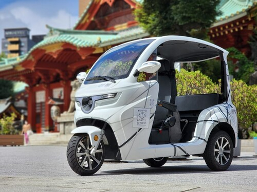 EV型トゥクトゥクは幅約1mで、見た目はバイクのようだが3人が乗車できる。1回の充電で約80kmの走行が可能。    EV TOKYO 提供