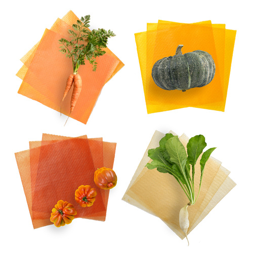 そのままでは廃棄されかねない規格外の野菜を厚さ0.1ミリのシートに加工したベジートは、サラダを巻いたり、おにぎりを包んだり、と様々な活用法があり、料理に手軽な彩りを与えてくれる。